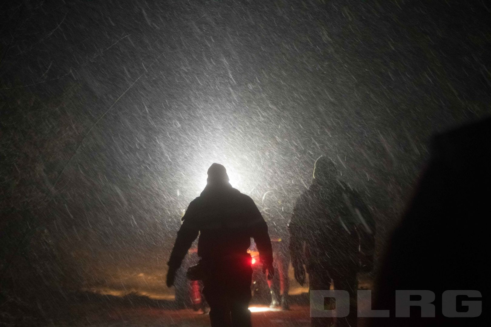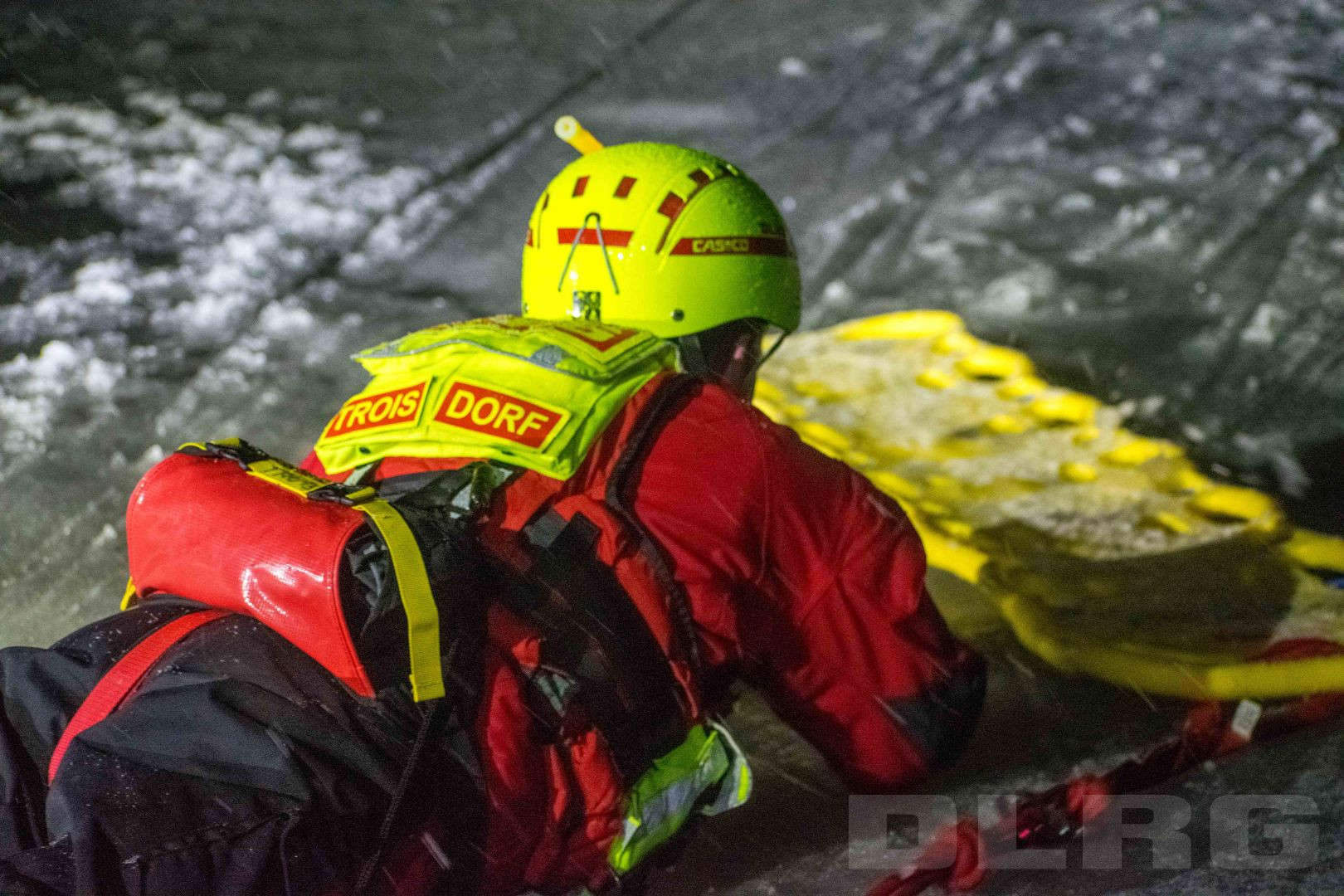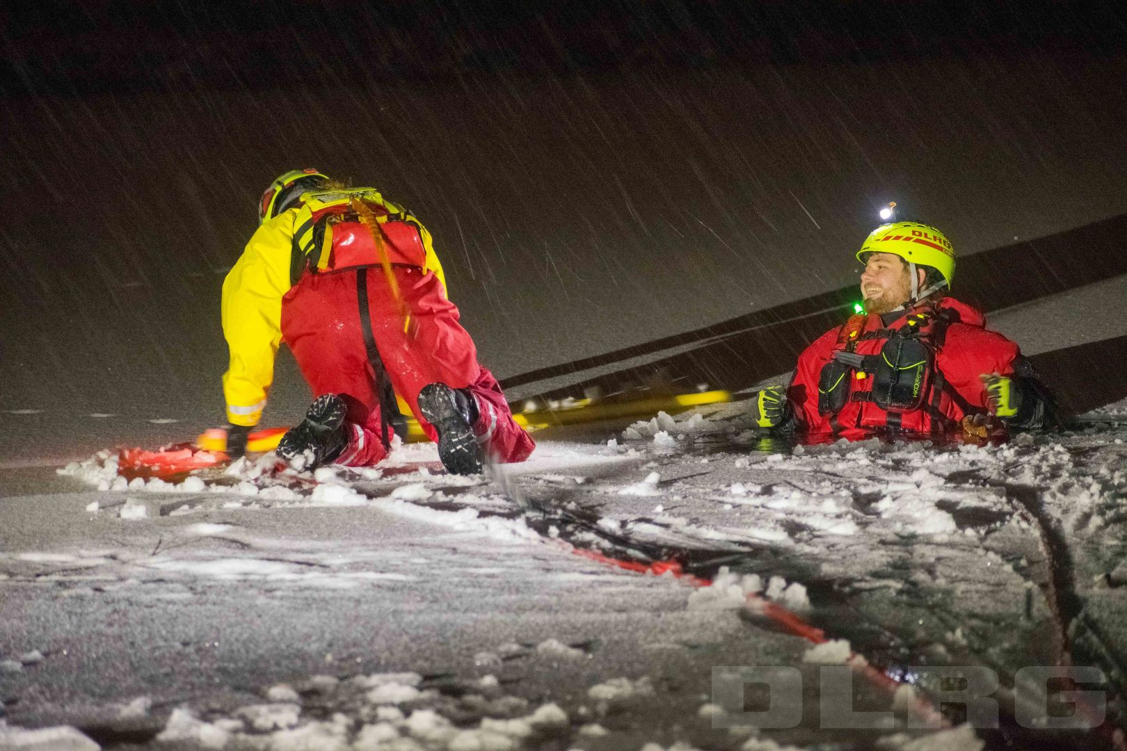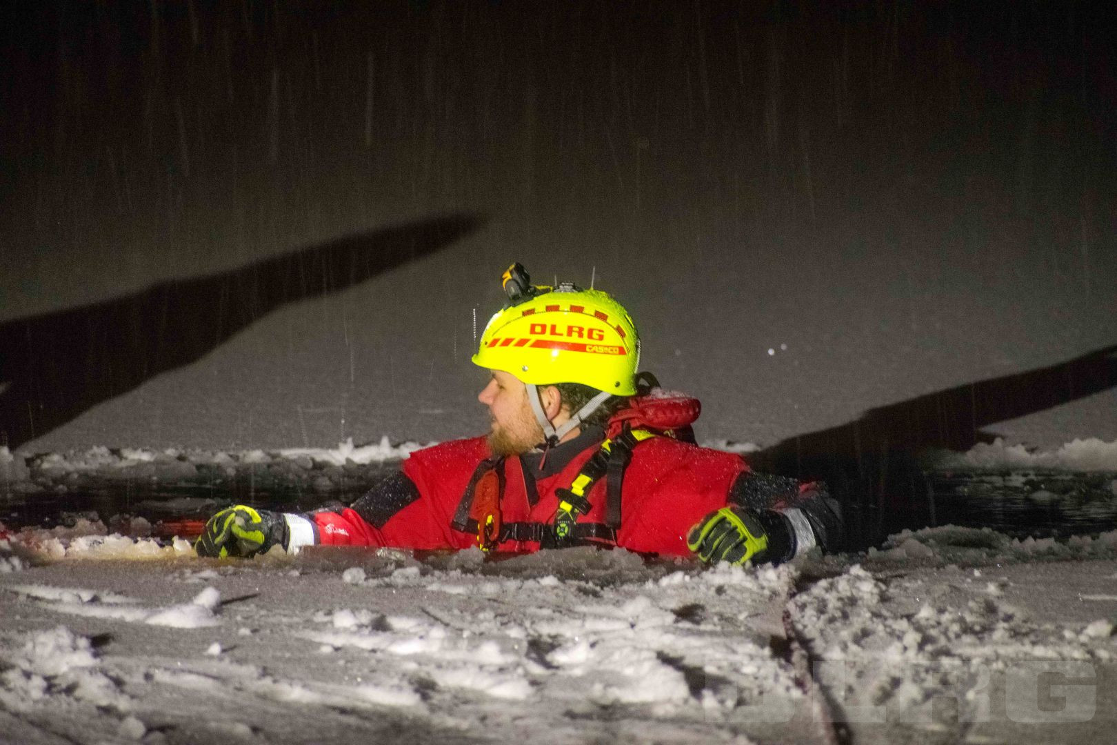 Danach wurden noch einige Übungspraktiken besprochen und geübt: Wie sichere ich den Eisretter gegen Einbrechen, welche Materialien gibt es und wie setzte ich sie sinnvoll und gefahrlos für die Rettung ein? Einige Strömungsretter wollten es unbedingt wissen und testeten kurz vor Ende der Übung noch die Dicke der Eisschicht (ca. 5-6 cm). Dank der guten persönlichen Schutzausrüstung und der Absicherung durch die Kameraden, war das dabei erfolgte Ergebnis – Einbruch ins Eis – nicht weiter schlimm. Bei einem warmen Tee wurde nach der Abschlussbesprechung die Übung gegen 22:30 Uhr beendet.